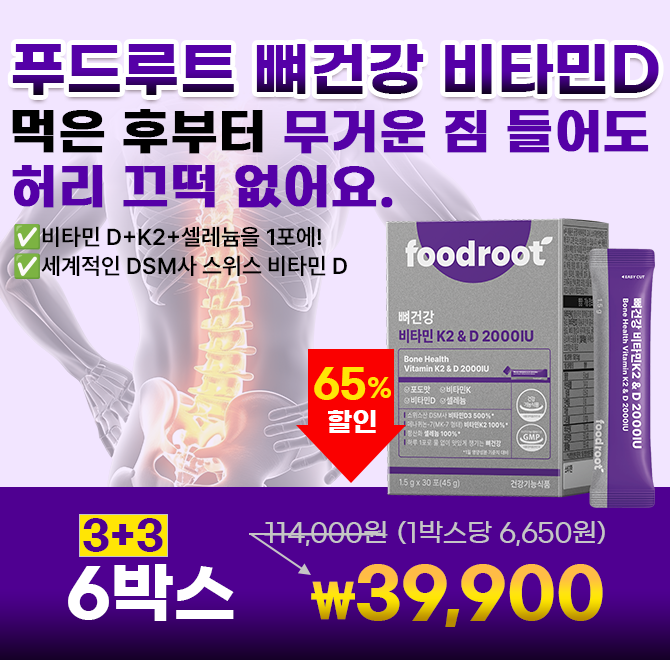 가벼운 화분만 들어도 욱신 거렸던 허리,푸드루트 비타민D 먹은 후부터 쌀 20kg 들어도 허리 거뜬해요! ⏰65% 초특가 할인중 햇빛을 쬐어야만 체내에서 합성되는 비타민D3는, D2보다 체내 OOO와 흡수율이 높습니다. 푸드루트 뼈건강 비타민에는 비타민D3가 일일섭취량 대비 500% 고합량으로 들어있습니다. 여기서 OOO는? (힌트 : ㅎㅅㄷ)