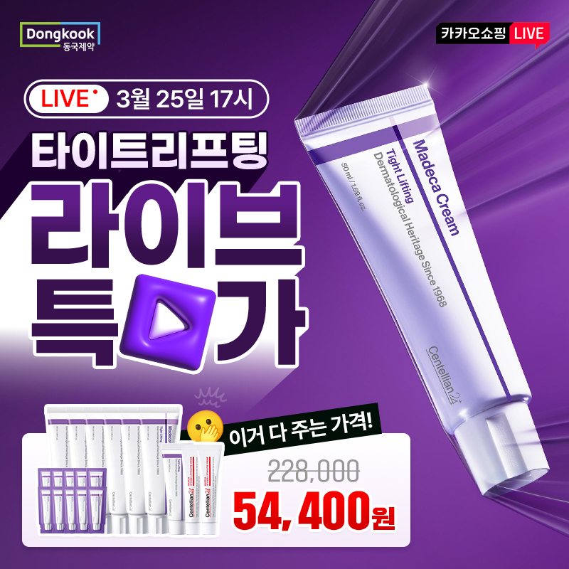 📢2026년 동국제약 마데카크림 타이트리프팅 특가 카카오쇼핑 페스타!🎉 꽉찬 리프팅으로 느슨한 피부 고민해결!✨ 💝구매금액별 사은품 증정 💓라이브 중 추가 사은품 증정 🛒주문인증추첨 이벤트 💌할인쿠폰지급 라이브 중 전구매고객 마데카더마마스크 인텐시브OOO포뮬러25ml*1매 증정 바로 구매하기 →→ (힌트: ㄹㅍㅌ)