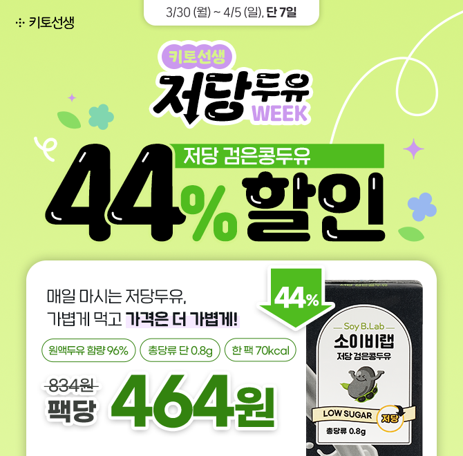 키토선생 저당두유 WEEK 오픈 🎉 당 관리 중에도 걱정 없이 마시는 저당두유! 당류, 칼로리 걱정 없이 가볍게, 할인 받고 가격은 더 가볍게~ 최대 특가 팩당 400원대 구매 가능! 소이비랩 저당 검은콩두유는 당류는 낮추고, OOO OOO 담았습니다. 천연감미료 알룰로스로 건강한 달~콤함! OOOOOO은 무엇일까요? (초성힌트 : ㅇㅇㅇㄱㄷㄹ)