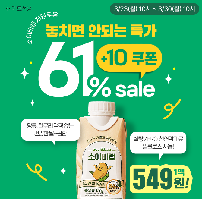 놓치면 안되는 특가⚡61% 할인에 10% 추가 할인 쿠폰까지! 오직 캐시딜에서만【저당두유 1팩 549원】으로 구매할 수 있는 기.회.🤩 (+무료배송 혜택) 설탕 ZERO 천연감미료 알룰로스로 달콤함을 살린 건강한 저당두유는 이런 분들께 추천드려요. 가볍고 맛있게 OOOO할 수 있는 음료를 찾으시는 분! OOOO은 무엇일까요? (힌트 : ㅇㅇㅂㅊ)