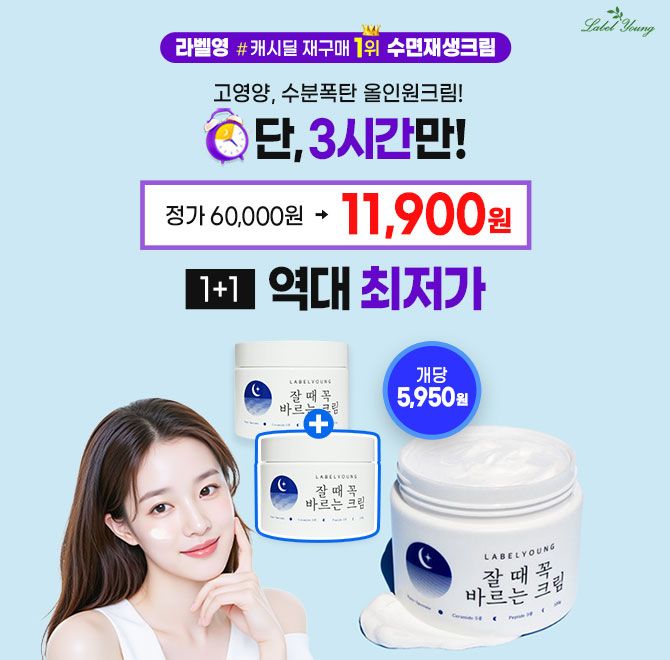 단 3시간 타임특가! 크림 재구매 1위 올인원 수면 재생크림 하나 사면 하나 더 1+1! OOOOO원+무료배송 혜택 세라마이드 5종 & 펩타이드 3종으로 보습·탄력 케어까지! 빈칸에 들어갈 숫자는 무엇일까요?