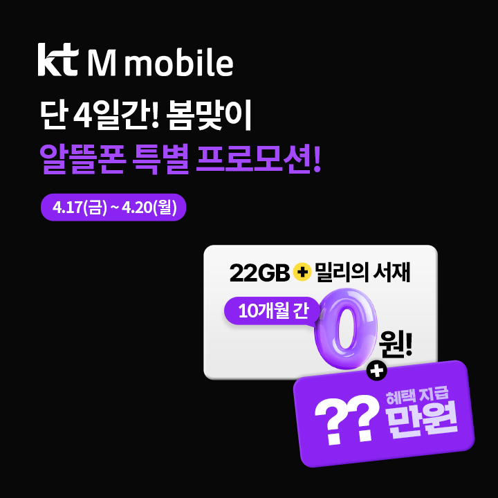 압도적 1등 알뜰폰! kt M모바일의 봄맞이 특별 프로모션! 4/17(금) ~ 4/20(월), 단 4일간 진행되는 프로모션 통해 가입하면 30만원 혜택과 ㅁㄷㄷㅁㄲ 7GB(밀리의 서재 FREE) 요금제를 체감가 0원으로 이용할 수 있어요!