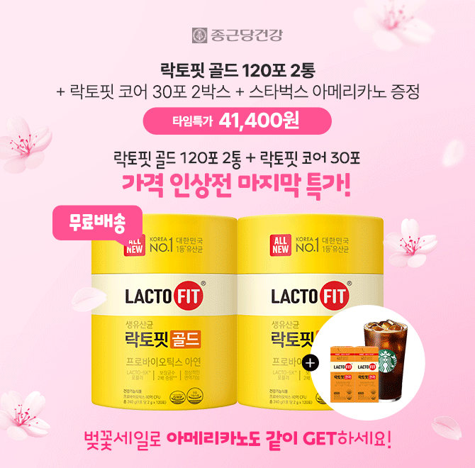 대한민국 1등 유산균, 종근당건강 "락토핏 골드 120포 2통" 을 "락토핏 코어 30포" 증정 구성으로 초특가 00,000원에 스타벅스 아메리카노 쿠폰 증정 이벤트까지 진행됩니다. 00,000에 들어갈 정답은 무엇일까요?