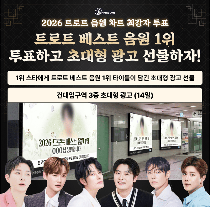 팬마음 트로트 베스트 음원 1위 투표에서는 1위를 달성한 스타에게 유동 인구가 많은 건대입구역에 OOOOO광고를 선물해 드려요.