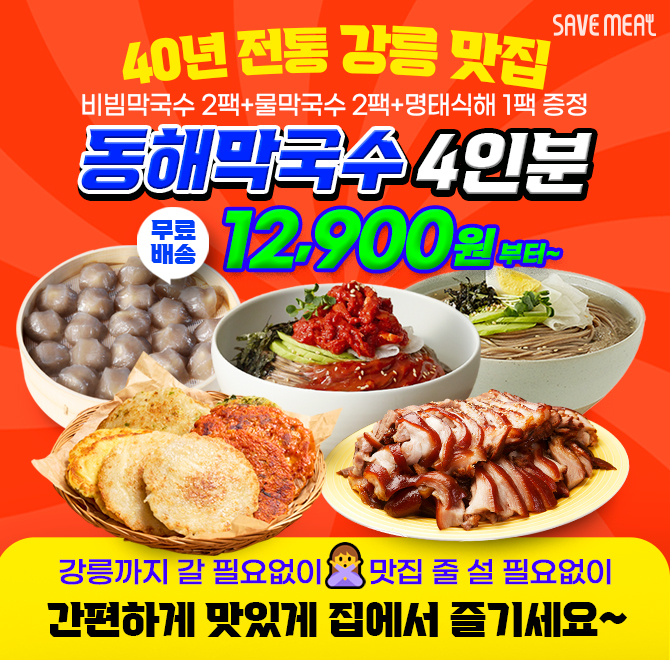 🚨딱1시간만🚨 🔥동해막국수 온라인 최저가!🔥 40년 전통 강릉 맛집 비빔막국수2팩+물막국수2팩 동해막국수 4인분에 명태식해 1팩 증정까지! 역대급 할인가 무료배송 "OOOOO"원! 오늘만! 전 옵션 명태식해 1팩 100%증정! 강릉까지 갈 필요없이! 맛집 줄 설 필요없이! 간편하게 맛있게 집에서 즐기세요! (+금액대별 사은품증정)
