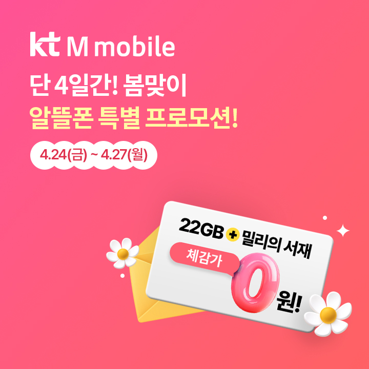 압도적 1등 알뜰폰! kt M모바일의 봄맞이 특별 프로모션! 4/24(금) ~ 4/27(월), 단 4일간 가입 시, ㅇㅂㅌㅋㄷㅂ을 입력하면 네이버페이 최대 33만원 혜택을 받으실 수 있어요!