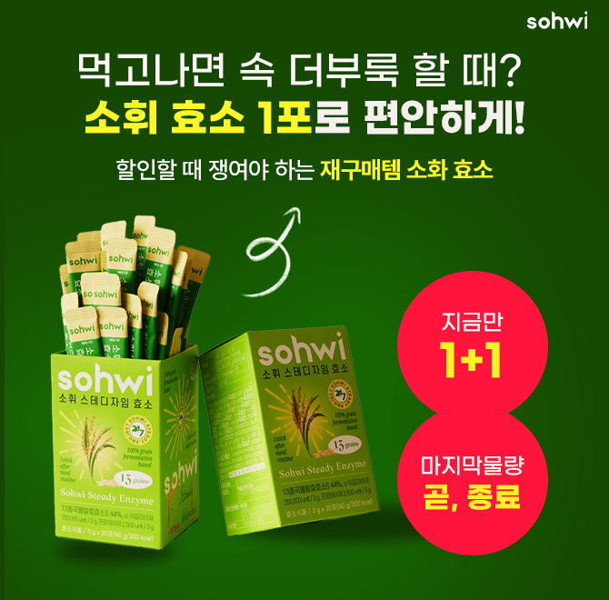 먹고 나면 속 더부룩 할때? 소휘 소화 효소 1포로 편안하게! ⏰1+1 물량 마감임박 나이들수록 효소는 꼭 외부 보충이 필요해요! 소휘 소화효소는 정제효소 없이 100% 통곡물 저분자 발효효소로 한국인 식습관에 딱 맞춘 균형잡힌 OOOO를 보장합니다. 지금이 쟁여둘 기회! 마지막 물량 곧 전체종료. 여기서 OOO은? (힌트 : ㅇㄱㅅㅊ)