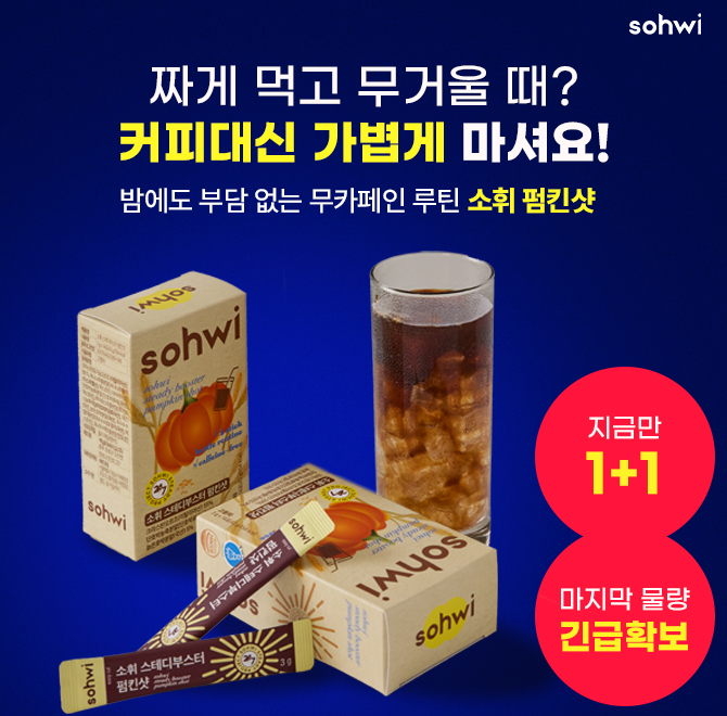 야식 먹고 또 후회하시나요? 커피대신 소휘 펌킨샷으로 날렵하게 관리하세요!⏰지금 여기서만 1+1 마지막 물량 긴급 확보🚨 소휘 펌킨샷은 나트륨 배출을 돕는 OO과 펙틴 위주의 배합으로 빠르게 땡땡한 느낌이 사라집니다. 100% 자연유래원료에 무카페인 펌킨샷으로 빠르게 날렵해지세요! 여기서 OO은? (힌트 : ㅋㄹ)