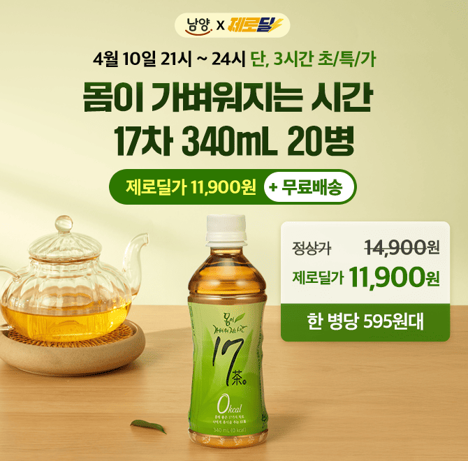 단 3시간 동안 진행되는 "캐시딜" 타임특가에서 약콩, 보리, 율무 등 무려 17가지 차가 들어있는 프리미엄 건강차, 십칠차 340ml가 역대급 할인 "OOOOO"원에 진행됩니다. 17차는 녹차의 떫은 맛은 없애 깔끔한 맛을 살리고 0칼로리로 부담없이 산뜻하게 건강을 챙길 수 있습니다. 빈칸에 들어갈 숫자는 무엇일까요?