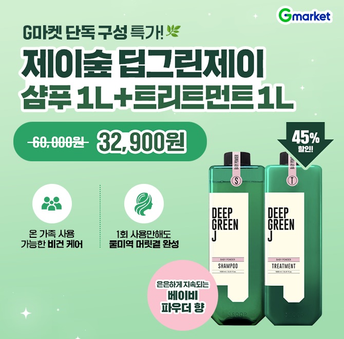 제이숲 딥그린제이 "OOO"파우더향 샴푸 1L+트리트먼트 1L G마켓 단독 구성 특가! 32,900원 ✅온 가족 사용 가능한 비건 케어 ✅은은하게 지속되는 "OOO"파우더 향! ✅1회 사용만해도 물미역 머릿결 완성