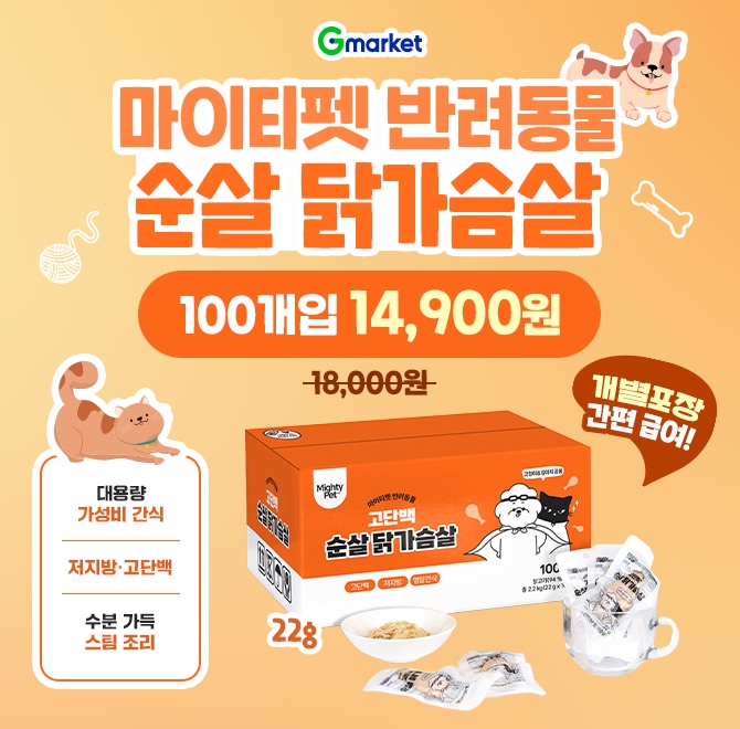 마이티펫 강아지 고양이간식 OOO 순살 닭가슴살 22g x 100개입 단하루 14,900원! ☑️저지방·고단백 ☑️수분 가득 스팀 조리 ☑️개별포장 간편 급여 G마켓 특가 바로가기 >>>