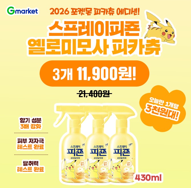 오늘 하루만 피죤 3개 11,900원! ✅ 향기 성분 3배 강화 ✅ 피부 저자극 테스트 완료 ✅ 탈취력 테스트 완료 (포켓몬) 스프레이피죤 옐로미모사(OOO)💚 오늘만 G마켓 특가로 만나요!