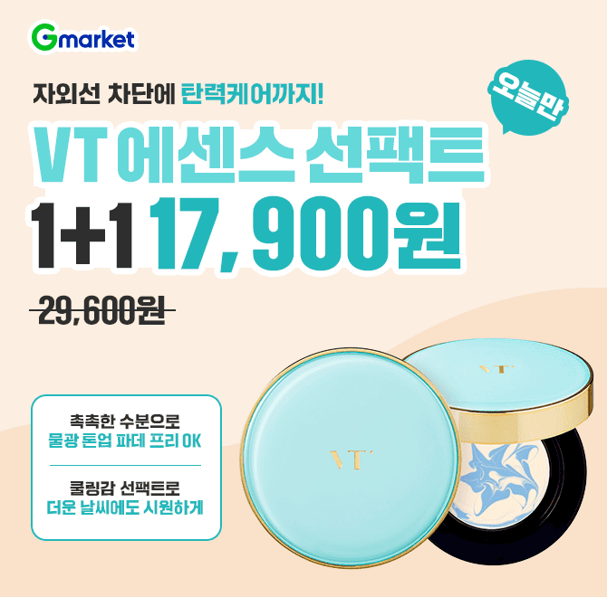 (1+1) VT 에센스 선팩트 "OO"g 총 2개 (속광 피부 선쿠션) 오늘 단 하루만, 17,900원 특가 찬스! > 촉촉한 수분으로 물광 톤업 파데 프리 OK > 쿨링감 선팩트로 더운 날씨에도 시원하게