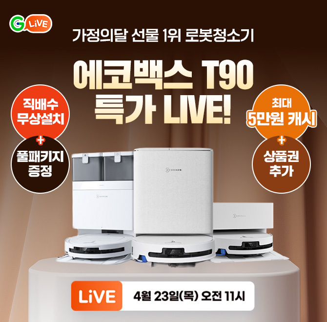 에코백스 T90 특가 LIVE! 가정의달 "OO" 1위 로봇청소기✨ ✔ 최대 5만원 캐시 + 상품권 추가 ✔ 직배수 무상설치 + 풀패키지 증정 ✔ 프리미엄 로봇청소기 라인업 구매 시 전원 혜택 적용 구매인증(베스킨 패밀리 아이스크림) 소통 이벤트(스타벅스 기프티콘) 득템까지!