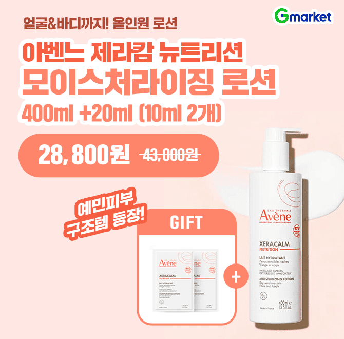 4/24(금) 단하루 아벤느 특가 예민피부 필수템 아벤느 얼굴+바디 올인원 로션! ✔ 400ml 대용량 + "OOO"크림 5ml 2개 추가 증정 정상가 4.3만 → 2.8만 특가! ✔ 온가족 사용 가능한 보습템 ✔ 민감피부 진정·보습 케어 지금 쟁여야 하는 보습템 찬스