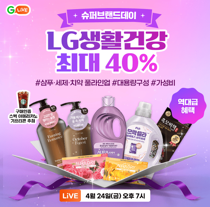 LG생활건강 슈퍼브랜드데이✨ 생활필수템 초"OO" LIVE! ✔ 샴푸·세제·치약 풀라인업 구성 ✔ 최대 40% 할인 역대급 혜택 ✔ 대용량 구성으로 가성비 득템 구매 인증 시 스벅 추첨 이벤트 지금 쟁여야 하는 타이밍 (힌트: ㅌㄱ)
