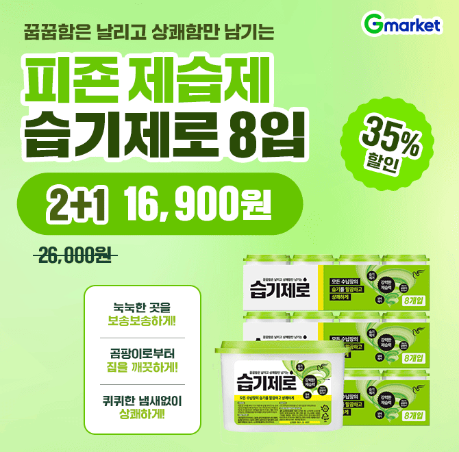 단 하루! 피죤 제습제 습기제로 8입 2+1 특가 찬스! ✅눅눅한 곳을 보송보송하게! 강력한 "OO"효과 ✅곰팡이로부터 집을 깨끗하게! ✅퀴퀴한 냄새없이 상쾌하게! G마켓 특가 놓치지마세요~!