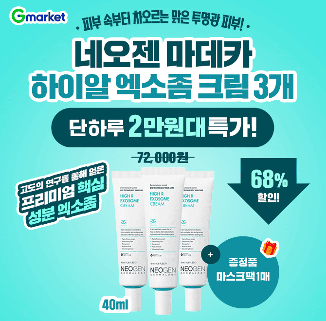 오늘만! 네오젠 마데카 하이알 엑소좀 크림 특가💙 3개에 단 하루 2만원대 특가! 피부 속부터 차오르는 맑은 "OOO" 피부, 하이알 엑소좀 크림! G마켓 특가 놓치지마세요~!
