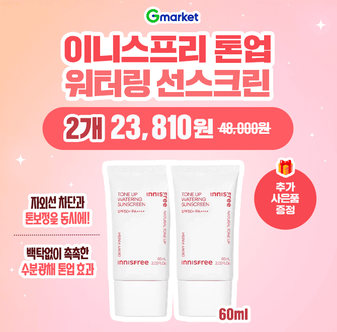 톤업 워터링 선스크린 "OO"ml 2개 2만원대 하루 특가 찬스! > 자외선 차단과 톤보정을 동시에! > 백탁없이 촉촉한 수분광채 톤업 효과! > 추가 사은품 증정까지!