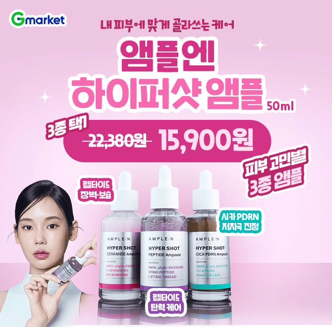 앰플엔 하이퍼샷 앰플 50ml (3종 택1) 펩타이드/세라마이드/ "OO" PDRN 단하루 특가 15900원 +앰플 7ml 추가 증정까지! 피부 고민별 3종 앰플 ✔ 펩타이드 → 탄력 케어 ✔ 세라마이드 → 장벽·보습 ✔ "OO" PDRN → 저자극 진정 지금 내 피부에 딱 맞게 PICK