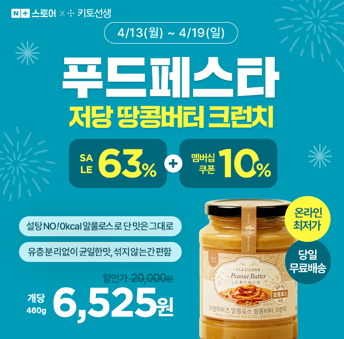 🎁[네이버 푸드페스타] 저당 땅콩버터 크런치 💵<63% 할인 + 멤버십 10% 추가 쿠폰 + 무료배송> (~ 4/19) 온라인최저가로 진행되는 초특가, 개당 6,525원으로 GET! 리얼마이즈 땅콩버터는 설탕 대신 알룰로스를 사용해 달콤함은 OOO OO하고 건강한 저당과 고단백으로 완성했어요. OOOOO는 무엇일까요? (초성힌트 : ㄱㄷㄹㅇㅈ)