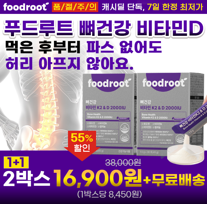 매일 붙였던 파스, 푸드루트 뼈건강 비타민D 먹은 후부터 없어도 허리 안아파요⏰비타민D 일주일 초특가 진행중⏰ 푸드루트 스위스산 비타민D는 비타민D3+K2+셀레늄 3종을 1포로 섭취 가능한 제품입니다. 캐시딜에서만 단 7일간 2박스 OOOOO원 무료배송으로 구매할 수 있습니다. 여기서 OOOOO는?