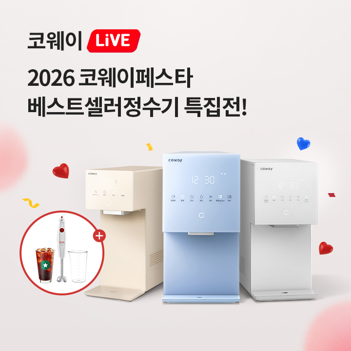 2026 NEW! 최신상! ㅇㅇㅋ정수기3! 초소형 얼음정수기! ㅇㅇㅋ 얼음 미니! 컴팩트한 사이즈, 풍부한 얼음양! ㅇㅇㅋ 얼음 스탠다드! 패키지 구매 시 렌탈료 15% 할인! 단독 경품 혜택까지! 방송 당일 구매 시, 테팔 핸드블렌더 터보믹스 100명 추첨 증정! 라이브 구매 인증 시, 스타벅스 아메리카노 100% 증정 혜택까지! 라이브 놓치지마세요!