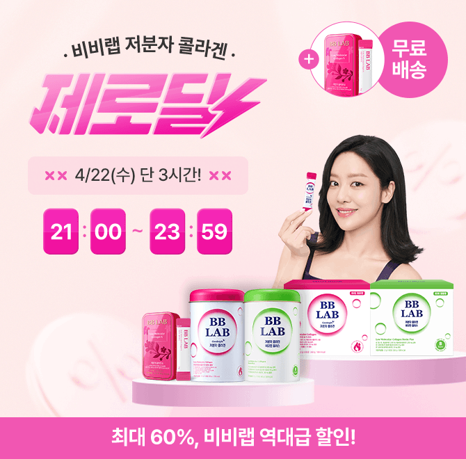 4/22 단 하루! 차주영이 선택한 대한민국 NO.1 비비랩 저분자 콜라겐 초특가+무료배송 진행 중입니다. 온몸 깊은 곳까지 흡수되며, 체내 흡수가 빠른 저분자 콜라겐이 1,200mg 함유되어 있는 인텐시브 비비랩 저분자 콜라겐S 미니 1통 (10포) 옵션의 제로딜 행사가는 OOOO원인데요. 빈칸에 들어갈 숫자는 무엇일까요?