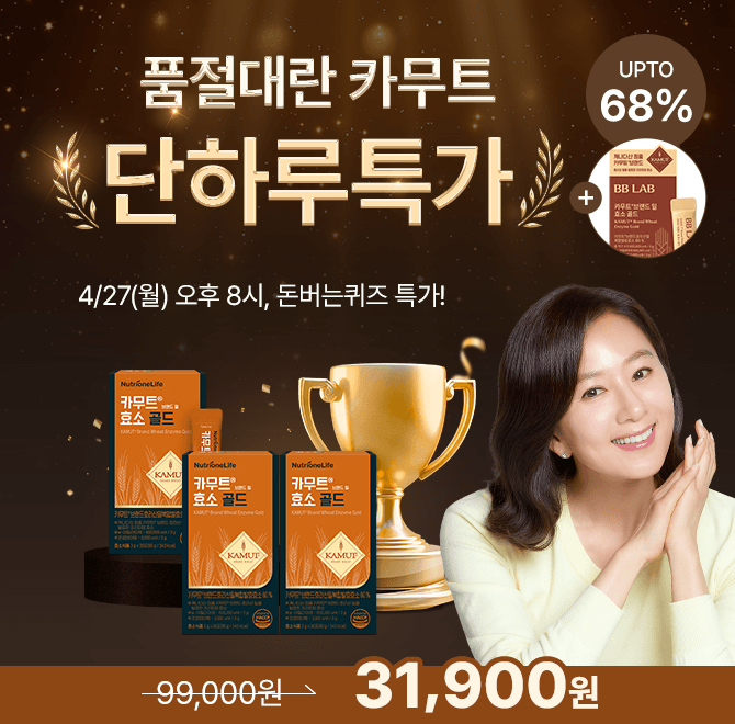 4/27 단 하루! 김희애가 선택한 ‘카무트 브랜드밀 효소 골드’ 초특가 + 무료배송 + 사은품 증정 혜택 진행 중! 탄수화물 섭취가 잦은 한국인의 식습관을 고려해 설계된 아밀라아제·프로테아제 함유 카무트 효소 💛 카무트 효소 3박스 옵션의 단독 특가는 OOOOO원인데요, 빈칸에 들어갈 숫자는 무엇일까요?